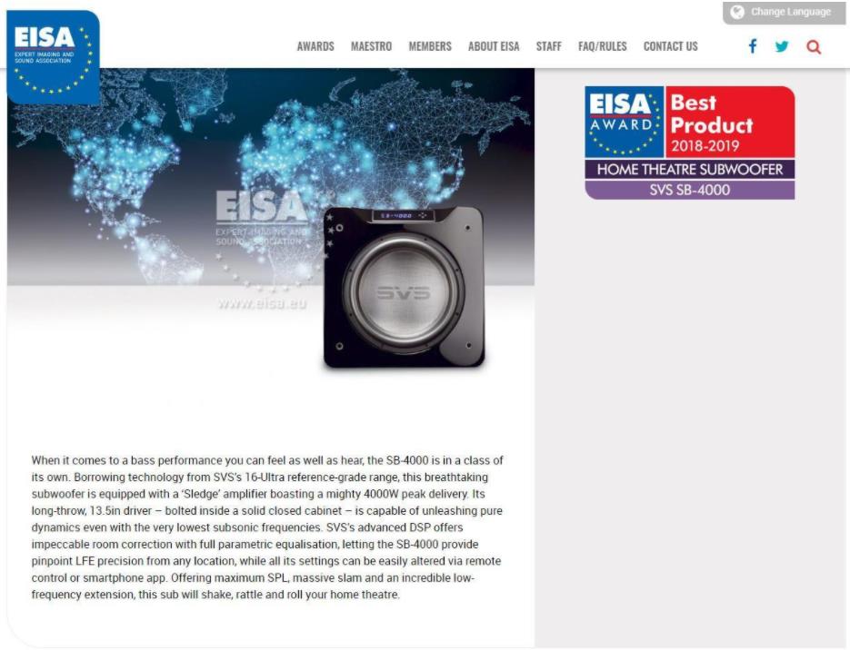 美国SVSound新品SB-4000荣获EISA年度最佳低音炮产品大奖