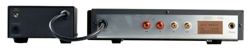 LP-1 MKII变压器前级的背面简洁得不能再简洁,只有一组高电平输入和输出接口,仅能接受一台信号源接入,及配置了一个耳机接口。虽然这样的配置给人的感觉很吝啬,但毕竟LP-1 MKII的销售对象是钟情于听音乐的发烧友,而且LP-1 MKII本身就是一件精品。因此,存在这种设计个性是正常的。另外,左边的电源供给器则有电池组切换开关