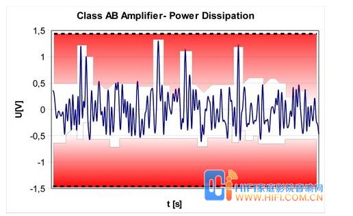 上述音频放大器的功率数值为峰值功率值。实际上,需要这个最大电源电压的时间极短;音频信号具有很宽的动态范围。大部分的时间,输出电压均低于0.5V,而放大器的电源电压却可达到1.5V。输出电压和电源电压之间的差异来自内部放大器晶体管所消耗的部分,这是电力损耗的主要原因。