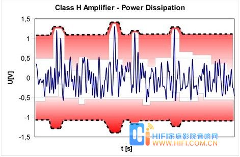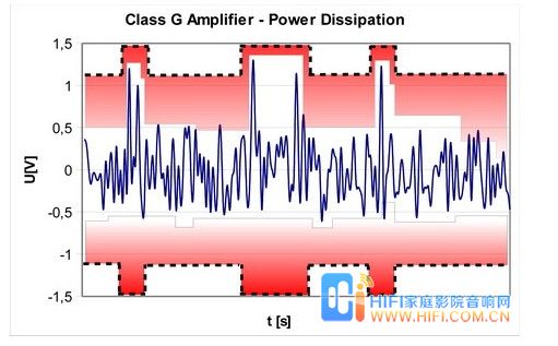 但是,这并不能掩盖除了在高输出电压水平以外,晶体管仍然会消耗大量电能的事实。要解决这个问题,需要改变放大器本身的电源配置,这就是开发G类和H类放大器的原因。