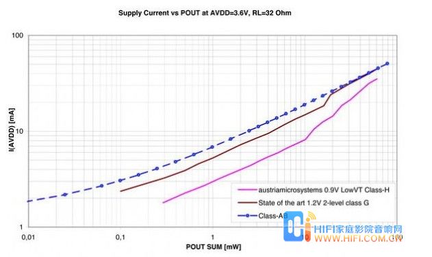 这正是奥地利微电子特殊的LowVT CMOS工艺的承诺。这些工艺已用于生产全新的AS3561器件。AS3561是一个H类放大器,可为耳机放大器提供低至±0.9 V的电源电压。搭配高效率DC-DC转换器及自适应式电荷泵,它可将功耗降至最低:2 x 0.1mW播放的电池电压为3.6V,典型电流消耗仅有1.7mA。这种高效率架构与G类及AB类架构之间的功耗差异见图4。